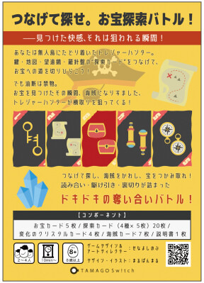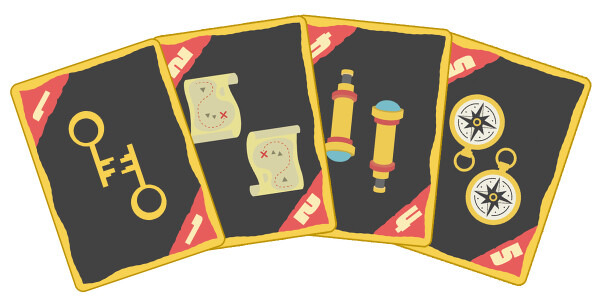 探索カードを 1~5の順番 につなげて「トレジャー!」を宣言し、お宝カードをの獲得を目指すカードゲームです。