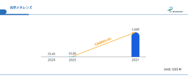 光学メタレンズ市場は、AR/VR、スマートフォン、光通信、医療用イメージングといった高度な光学応用の普及に支えられ、急速な市場成長が予測される。LP Information調査チームの最新レポートである「世界光学メタレンズ市場の成長予測2025~2031」(https://www.lpinformation.jp/reports/552752/optical-metalens)によると、2025年から2031年の予測期間中のCAGRが95.4%で、2031年までにグローバル光学メタレンズ市場規模は36.69億米ドルに達すると予測されている。