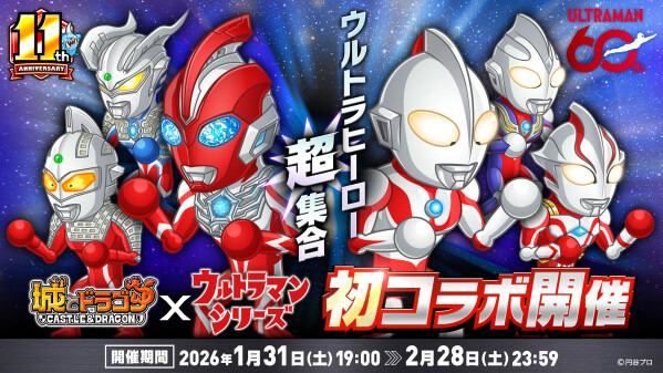 1月31日(土)19:00より『城とドラゴン』11周年を記念して、今年で放送開始から60周年を迎える「ウルトラマンシリーズ」との初のコラボイベントを開催中です。期間中は、コラボ限定キャラ「ウルトラヒーロー」が「ウルトラマンアバたま」に登場。さらに城ドラキャラの新しい激レアお着替えとしてアークエンジェルの「バルタン星人風セット」やアカズキンの「ゼットン風セット」なども登場します!なお、交換所でいろいろなアイテムを交換できる「ウルトラマンメダル」がGETできたりと、報酬も盛りだくさんな期間限定のコラボとなっております。また、2月14日(土)には城ドラ11周年を記念したリアルイベントが開催され、ウルトラマンたちが登場するスペシャルな企画も予定しておりますのでお楽しみに!