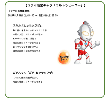 ※その他の「ウルトラマンアバたま」に関する詳細はゲーム内お知らせに記載されておりますので、必ずご確認ください