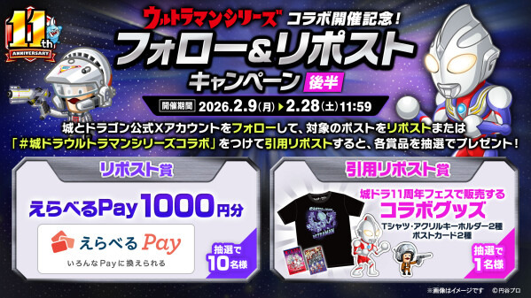 コラボ開催を記念して、「コラボ開催記念!フォロー&リポストキャンペーン後半」を実施します。『城とドラゴン』公式Xアカウント(@shirotodoragon)が投稿したキャンペーン対象ポストを公式リポスト、またはハッシュタグ「#城ドラウルトラマンシリーズコラボ」をつけて引用リポストされた方の中から抽選で各賞品をプレゼントいたします。
