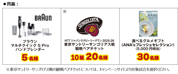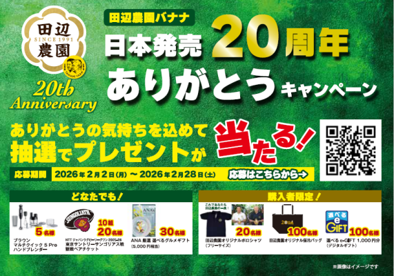 「田辺農園バナナ日本発売20周年ありがとうキャンペーン」は、どなたでも応募できるオープンキャンペーンとご購入者限定のマストバイキャンペーンを同時開催。オープンキャンペーンでは、昨シーズンに続き、2025-26シーズンもクラブサプライヤーを務めるラグビーチーム「東京サントリーサンゴリアス」の観戦ペアチケットやANAフーズの選べるグルメギフト「ANA’sフレッシュセレクション(5,000円相当)」などをご用意しました。マストバイキャンペーンは、何度でも応募が可能で、購入総額に応じて当選確率がUP、ここでしか手に入らない「田辺農園バナナ日本発売20周年オリジナル保冷バッグ」や「田辺農園オリジナルポロシャツ」などが抽選で当たります。