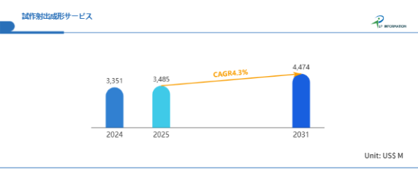 LP Information調査チームの最新レポートである「世界試作射出成形サービス市場の成長予測2025~2031」(https://www.lpinformation.jp/reports/249227/prototype-injection-molding-service)によると、2025年から2031年の予測期間中のCAGRが4.3%で、2031年までにグローバル試作射出成形サービス市場規模は44.74億米ドルに達すると予測されている。