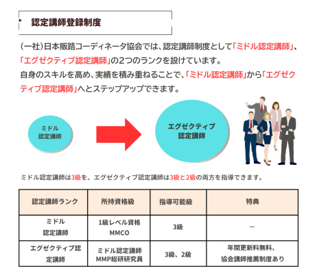 日本観光文化協会の資格取得のための研修を、自身で開催できる人材が認定講師です。認定講師資格の取得には各協会の上位資格1つ以上の他にMMCOの取得が必要です。初級クラス講習を開催できるミドル認定講師と、中位クラス講習を開催できるエグゼクティブ認定講師の2レベルがあります。講師認定講習会は毎年2・3月に実施しています。
