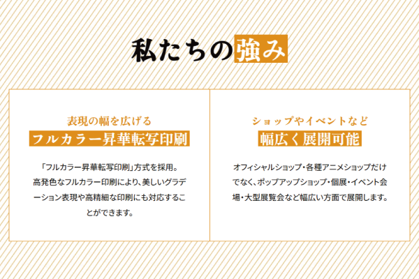 商品の製作現場と密に連携し、企画から製造までの工程を自社で一貫して管理しています。 繊細なグラフィックの再現と丁寧な縫製によって、作品の世界観を大切にしたアイテムに仕上げます。 私たちは「安心して作品を預けられるパートナー」として、ファンの皆さまへ「作品への愛を感じるお気に入り」をお届けできるよう、一歩ずつ歩みを積み重ねてまいります。