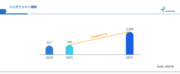 LP Information調査チームの最新レポートである「世界バイオナイロン繊維市場の成長予測2026~2032」(https://www.lpinformation.jp/reports/593593/bionylon-fiber)によると、2025年から2031年の予測期間中のCAGRが15.1%で、2031年までにグローバルバイオナイロン繊維市場規模は22.08億米ドルに達すると予測されている。