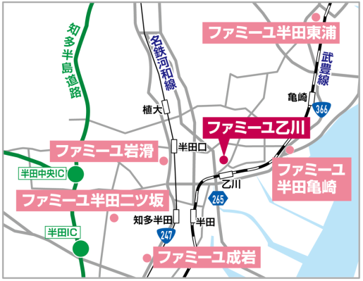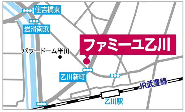 新ホールが立地する乙川地区は、衣浦湾に面する半田市の北東部に位置し、緑や水に恵まれたエリアです。自然豊かな一方で大型商業施設も集まり、人や車が行き交う街並みが特徴です。既存5ホールの中心となる乙川地区への出店で、これからも地域の皆さまにファミーユの家族葬を提供します。