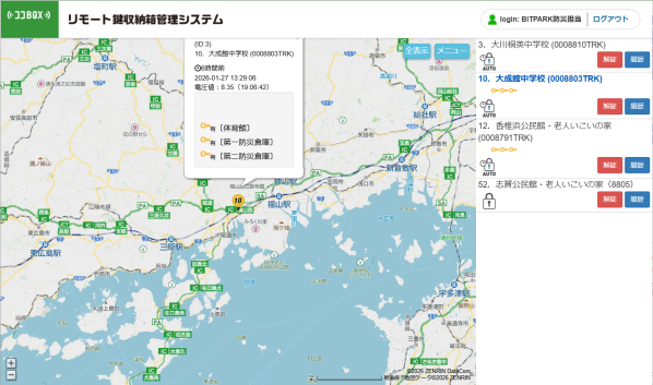 自社プロダクトである防災ソリューションの製品「ココBOXII」の紹介では、学生たちが通う大成館中学校が避難所となっている想定のもと、デモンステレーションを行いました。