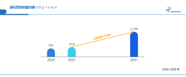 本市場の成長を牽引する主な要因には、世界的な高齢化とがん罹患率の増加がある。治療対象となる高齢者の割合が増加する中で、安全性と快適性を両立した放射線治療への期待が高まり、非侵襲的かつ個別最適化が可能な適応型ソリューションの需要は拡大している。また、医療の質を「治療成績+生活の質(QOL)」で評価する傾向が強まる中、副作用の低減や治療中断リスクの抑制に寄与する本技術は、費用対効果の観点からも優位性がある。さらに、保険償還制度の整備や医療機関のDX(デジタルトランスフォーメーション)対応が進む中で、統合型かつ柔軟なソリューションへの移行が進んでおり、今後も技術進化と制度変革が相互に作用する形で、市場の継続的拡大が期待される。