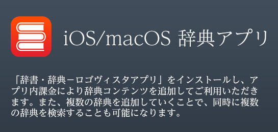 iOS/macOS版「辞書・辞典-ロゴヴィスタアプリ」をインストールし、アプリ内課金により辞典コンテンツを追加してご利用いただきます。また、複数の辞典を追加していくことで、同時に複数の辞典を検索することも可能になります。