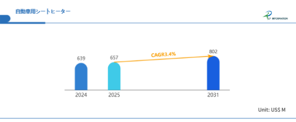LP Information調査チームの最新レポートである「世界自動車用シートヒーター市場の成長予測2025~2031」(https://www.lpinformation.jp/reports/564976/automotive-seat-heater)によると、2025年から2031年の予測期間中のCAGRが3.4%で、2031年までにグローバル自動車用シートヒーター市場規模は8.02億米ドルに達すると予測されている。
