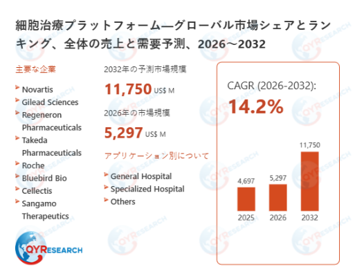 2025年における細胞治療プラットフォームの世界市場規模は、4697百万米ドルと予測され、2026年から2032年の予測期間において、年間平均成長率(CAGR)14.2%で成長し、2032年までに11750百万米ドルに達すると予測されている。