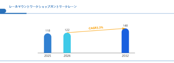 Global Reports調査チームの最新レポート「グローバルレールマウントワークショップガントリークレーン市場規模、主要企業シェア、ランキング分析レポート【2026年版】」によると、2026年の122百万米ドルから2032年には148百万米ドルに成長し、2026年から2032年の間にCAGRは3.3%になると予測されています。