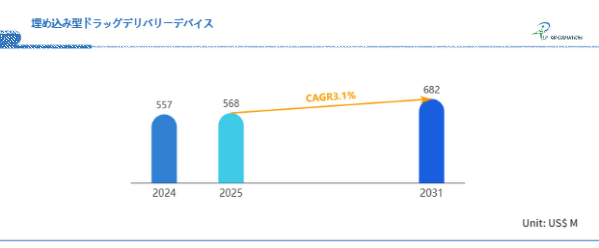 LP Information調査チームの最新レポートである「世界埋め込み型ドラッグデリバリーデバイス市場の成長予測2025~2031」(https://www.lpinformation.jp/reports/143010/implantable-drug-delivery-devices)によると、2025年から2031年の予測期間中のCAGRが3.1%で、2031年までにグローバル埋め込み型ドラッグデリバリーデバイス市場規模は6.82億米ドルに達すると予測されている。
