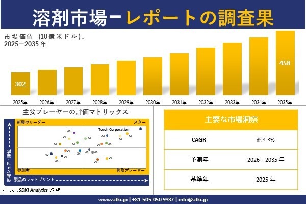 溶剤 市場に関する当社の調査レポートによると、溶剤 市場規模は 2035 年に約 458 億米ドルに達すると予想されています。さらに、2025 年の 溶剤 市場規模は約 302億米ドルとなっています。溶剤 に関する市場調査レポートでは、市場は 2026-2035 年の予測期間中に約 4.3% の CAGR で成長するとも述べられています。