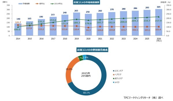 ◆2026年については2025年比3.4%増の305億円となる見込み。物価高騰下でもご褒美消費や自己投資需要は堅調で、機能性と使用時の満足感を両立した製品が求められている。化粧品市場において、炭酸自体の新規性は低下しているものの、炭酸コスメは『機能』と『体感』の両面で差別化できるカテゴリーとして存在感を高め、化粧品市場全体の多機能化・プレミアム化とも親和性が高いといえる。今後は炭酸そのものではなく、『体験価値』や『使用シーン設計』、『炭酸+αのストーリー性』をどう設計するかが、ブランド成長の鍵になると考えられる。
