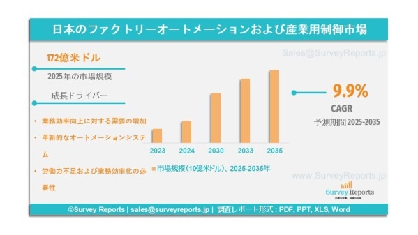 Surveyreportsの専門家による日本のファクトリーオートメーションおよび産業制御市場調査の分析によれば、同市場規模は2025年に172億米ドルを創出したことが明らかとなった。さらに、日本のファクトリーオートメーションおよび産業制御市場の売上高は、2035年末までに378億米ドルに達すると予測されている。同市場は、2025年から2035年の予測期間において、約9.9%の年平均成長率(CAGR)で成長すると見込まれている。