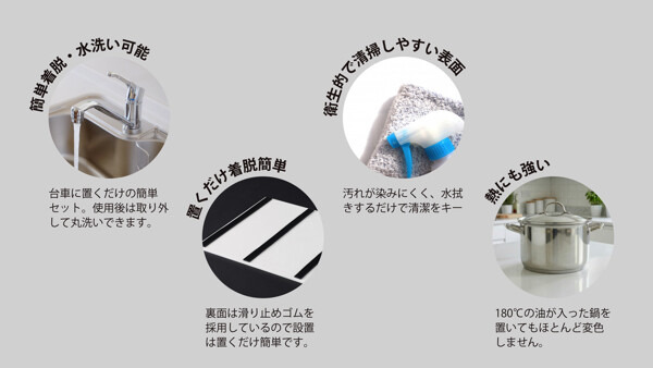 水が染み込みにくく、衛生管理がしやすい日常的な使用において、熱に配慮された素材特性を持つ