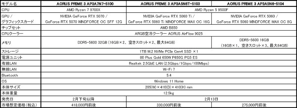 上位モデル「AORUS PRIME 3 AP3A7N7-5100」は、CPUにAMD Ryzen 7 9700X(8コア/16スレッド、3.8GHz/最大ブーストクロック5.5GHz)、GPUにNVIDIA GeForce RTX 5070 12GBを採用しています。中位モデル「AORUS PRIME 3 AP3A5N6T-5103」は、CPUにAMD Ryzen 5 9500F(6コア/12スレッド、3.8GHz/最大ブーストクロック5.5GHz)、GPUにNVIDIA GeForce RTX 5060 Ti 16GBを採用。また、下位モデルとして、CPUにAMD Ryzen 5 9500F、GPUにNVIDIA GeForce RTX 5060 8GBを採用した「AORUS PRIME 3 AP3A5N6-5104」もラインナップします。
