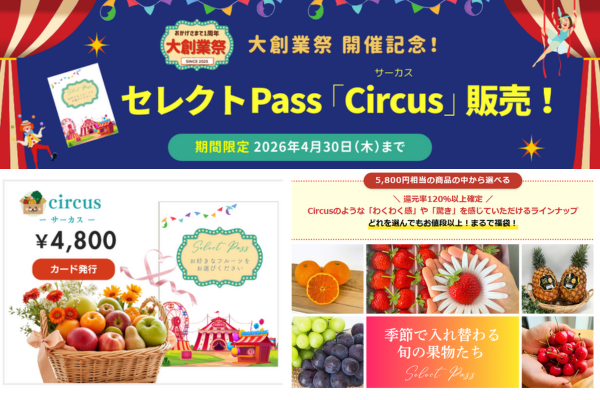 受け取った方がお好きな商品を選べるWebカタログギフト「セレクトPASS」に、1周年限定デザインの「CIRCUS/サーカス」が登場です!