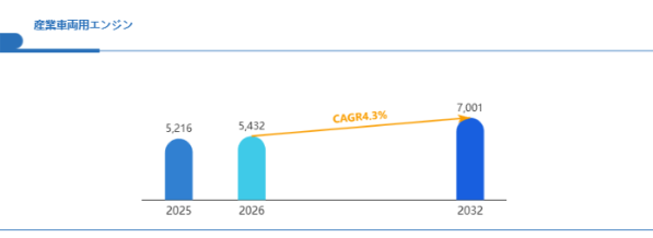 農業の大規模化・効率化や鉱山・エネルギー開発の拡大に伴い、高出力で連続稼働が可能な車両の導入が進んでおります。これらの分野では過酷な作業環境への適応が求められるため、信頼性と耐久性に優れた産業車両用エンジンの需要が安定的に拡大しております。