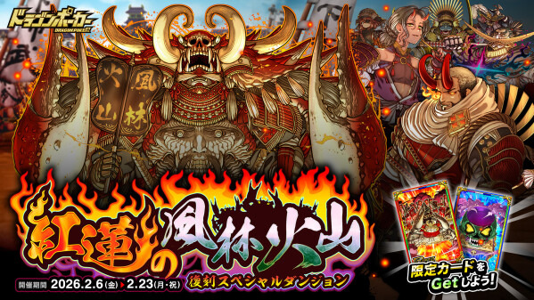 2月6日(金)より、復刻スペシャルダンジョン「紅蓮の風林火山」を開催いたします。本ダンジョンには新たに「甲斐の虎蟹シンゲン」などが登場!仲間と共に戦場を駆け抜けろ!
