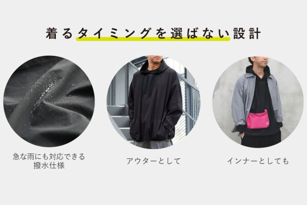 「パッカブルプルオーバーパーカー」は、1枚で普段使いのパーカーとしてはもちろん、アウターとして上から被ったり、コートの中に重ねてインナーとして使うなど、年間を通して様々なシーンでご着用いただけます。シルエットは、オーバーサイズに設定することで、着ている服の上からも重ねて着やすく、体型をカバーしながら、体も冷やしにくい絶妙な丈感を採用しました。撥水性に優れ、ストレッチの効いた生地を採用しているため、急な雨のシーンにも対応できる安心感があり、ストレスフリーな着心地も魅力です。