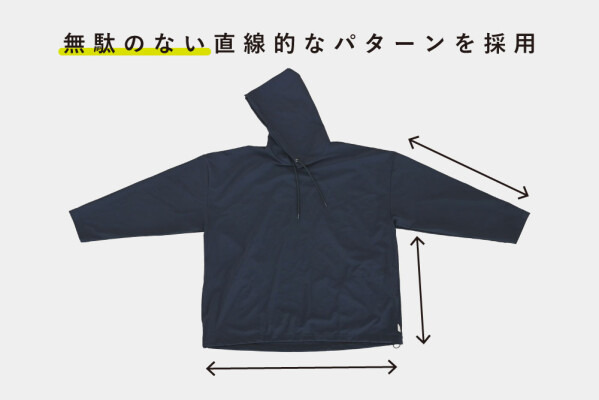 「パッカブルプルオーバーパーカー」に採用した、KAJIF STRETCH PLEASURE(R)という生地は、シワになりにくいため、パッカブルな状態から取り出してすぐにご着用いただけ、旅行はもちろん、朝晩の防寒対策に持ち歩きやすいのもポイントです。また、リサイクルナイロン生地を採用することだけに満足せず、パターンも極力、無駄をなくすように計算しています。生地は縦長のため、できるだけ直方体のパターンにすることで裁断端材を少なくし、環境負荷を少しでも減らながら、コストも削減し、アイテム価格にも反映できるよう努めています。
