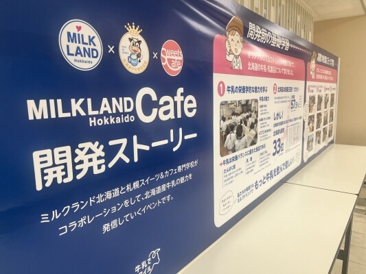 今回は、北海道牛乳普及協会様主催のイベント「ミルク&ナチュラルチーズフェア2026」札幌会場にて、北海道の牛乳のおいしさの理解浸透を目的に「MILK LAND Hokkaido CAFÉ」を運営。ミルクカレッジで学んだ知識を活かして学生らが考案した牛乳・乳製品をベースとした家庭向けミルクドリンクを製造・販売しました。