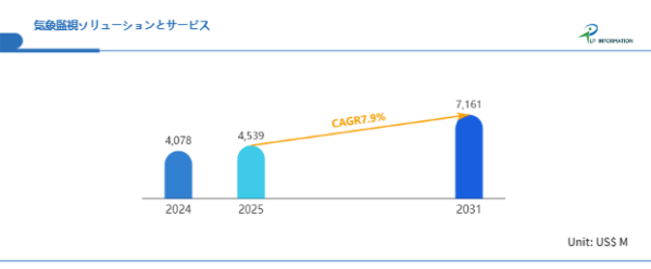 LP Information調査チームの最新レポートである「世界気象監視ソリューションとサービス市場の成長予測2026~2032」(https://www.lpinformation.jp/reports/588219/weather-monitoring-solutions-and-services)によると、2025年から2031年の予測期間中のCAGRが7.9%で、2031年までにグローバル気象監視ソリューションとサービス市場規模は71.61億米ドルに達すると予測されている。