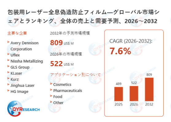 2032年の世界包装用レーザー全息偽造防止フィルム市場は約809百万米ドルに達すると見込まれています。今後の成長軌道は年平均成長率(CAGR)7.6%で推移し、2026年には市場規模が522百万米ドル、2025年時点では約489百万米ドルと推計されています。