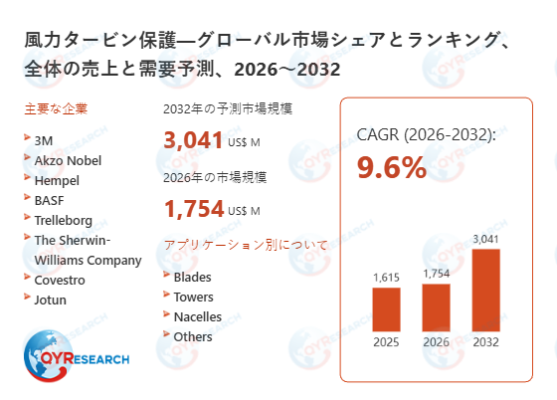 2025年における風力タービン保護の世界市場規模は、1615百万米ドルと予測され、2026年から2032年の予測期間において、年間平均成長率(CAGR)9.6%で成長し、2032年までに3041百万米ドルに達すると予測されている。