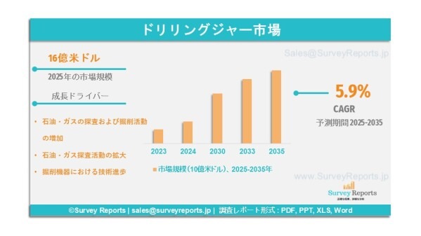 Surveyreportsの専門家による分析によれば、ドリリングジャー市場規模は2025年に16億米ドルを創出したことが確認されている。さらに、同市場は2035年末までに28億米ドルの収益規模に達すると予測されている。ドリリングジャー市場は、2025年から2035年の予測期間において、年平均成長率(CAGR)約5.9%で成長すると見込まれている。