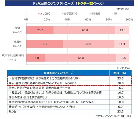 さらに、現在の治療状況について、一定以上の課題意識を有しているドクターが多く、複数ドメイン(皮膚、関節)および難治例に有効性が高い治療選択肢が不十分、費用・制度面で十分な治療が受けられないなど、最適な治療を受けるための治療環境が十分に整っていないことが示唆されている。
