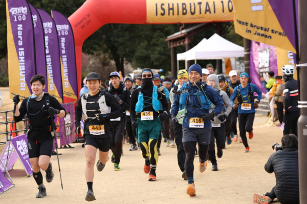 石舞台100は奈良の里山を舞台に、40kmのコースを3周する120K部門をメインとした大会です。2周の80K、1周の40K、ロード比率高めの25K、2.6kmのKIDS部門も行われました。