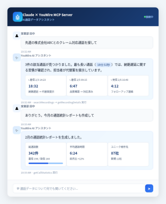 Claude・ChatGPT等の生成AIから自然言語で通話データを検索・分析・レポート生成。350社超の導入実績を持つクラウド型通話録音サービス「YouWire」が、AIエージェント時代の音声データ活用を実現。