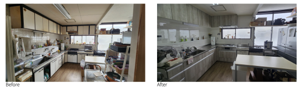 観音扉のセクショナルキッチン(上)から継ぎ目がなく引き出し式のシステムキッチン「STEDIA」へ(下)。「引き出しの中がステンレスで清潔で、かつ、収納力と作業性が向上し、料理がしやすくなりました!」(大内理事長談)