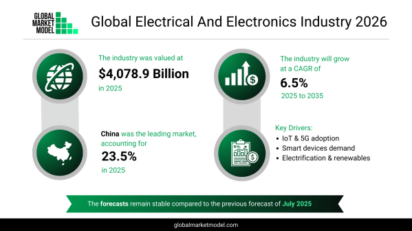 2025年において、世界の電気・電子市場は4兆789億ドルと評価されており、2035年まで年平均成長率6.5%で成長すると予測されている。拡大は、デジタル統合とエネルギー転換への並行した移行によって支えられている。電子技術は現在、消費者の生活様式、産業オートメーション、モビリティシステム、再生可能エネルギーネットワークに不可欠となっている。
