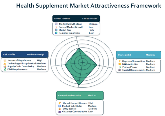 世界健康サプリメント市場は、人口動態変化、予防医療意識、技術統合に支えられた構造的成長を示している。規制強化および価格感応度は引き続き調整要因となるが、市場は科学的検証、個別化、機能特化へと進化している。