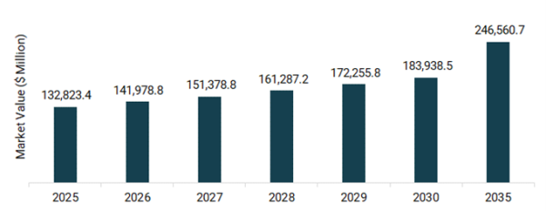 今後、市場は二〇三〇年までに一千八百三十九億三千八百五十万ドルへと成長し、二〇二五年から二〇三〇年の間に年平均成長率六・七%で拡大すると予測される。その後はやや成長が緩やかとなり、二〇三〇年から二〇三五年にかけて年平均成長率六・〇%で推移し、二〇三五年には二千四百六十五億六百七十万ドルに達する見込みである。