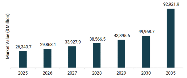 地域別では、二〇二五年に北米が三四・九%、九十一億八千八百六十万ドルで最大シェアを占めた。アジア太平洋および西欧がこれに続く。