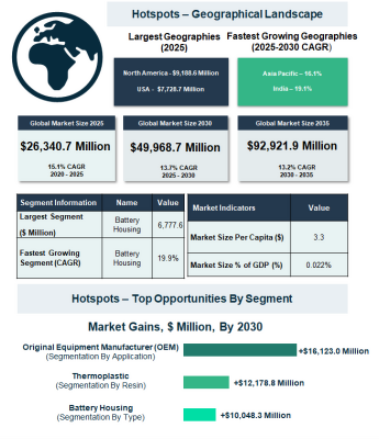 同分野は二〇二五年から二〇三〇年にかけて年平均一九・九%で拡大する最も成長の速い分野と予測される。これは、航続距離向上と熱安定性・安全基準維持を両立する軽量かつ耐久性の高い電池筐体への需要拡大を反映している。
