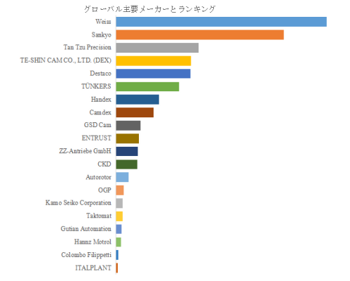 精密技術を競うグローバル舞台の主役たち ロータリーインデクサ市場は、少数のグローバル企業が高い技術力で市場をリードしている。LP Informationによると、2024年時点で上位10社が世界市場シェアの約56.0%を占める。主要企業には、Weiss(ドイツ)、Sankyo(日本)、Tan Tzu Precision(台湾)、TE-SHIN CAM CO., LTD. (DEX)、Destaco(米国)、TÜNKERS(ドイツ)、Camdex、Handex、GSD Cam、ENTRUSTなどが名を連ねる。 これらの企業は、長年にわたる機械加工ノウハウと独自のカム設計技術を基盤に、信頼性と耐久性を両立した製品を展開している。特にSankyoとWeissは、高速・高精度分度機構において世界的な評価を確立しており、電子部品や医療装置ラインでの採用実績が豊富である。 市場競争は価格よりも技術・信頼性・アフターサービスの総合力勝負へと移行しており、各社はAI制御、デジタルツイン技術、遠隔監視機能などを組み合わせた「次世代ロータリーインデクサ」の開発を進めている。
