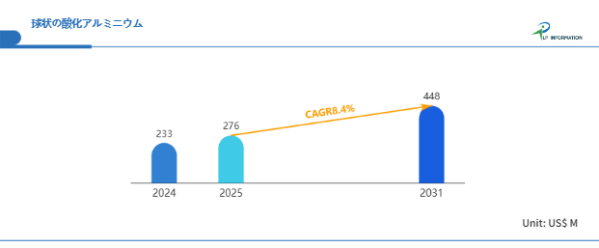 LP Information調査チームの最新レポートである「世界球状の酸化アルミニウム市場の成長予測2026~2032」(https://www.lpinformation.jp/reports/584774/spherical-alumina)によると、2025年から2031年の予測期間中のCAGRが8.4%で、2031年までにグローバル球状の酸化アルミニウム市場規模は4.48億米ドルに達すると予測されている。