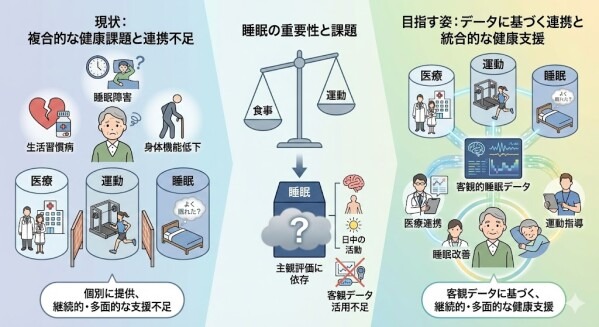 睡眠は身体機能や日中の活動への影響が大きく、食事・運動と並ぶ健康の基盤ですが、主観評価に依存しがちであり、客観的なデータ活用の仕組みが十分普及していませんでした。