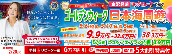 ・大改装のコスタセレーナで行く 舞鶴・釜山・下関 ショートクルーズ 5 日間-金沢発着-出発日:2026 年 5 月 6 日(水・祝)