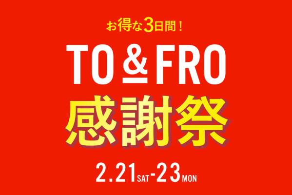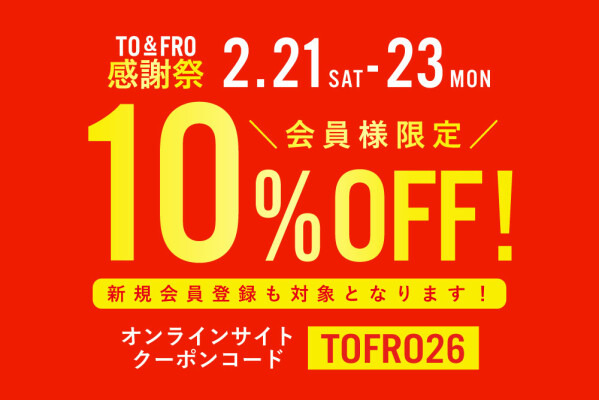 2/21(土)~2/23(月・祝)の「TO&FRO感謝祭」を実施する3日間は、全アイテムを10%オフでお得にお買い求めいただけます。特にご注目いただきたいのは、他ブランドとのコラボレーションアイテムで、コラボアイテムが割引になるのは「TO&FRO感謝祭」のみとなっております。