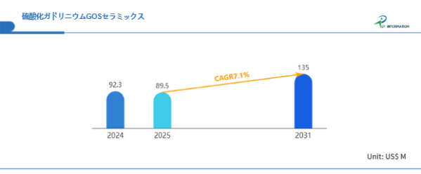 LP Informationの最新市場調査レポート「世界硫酸化ガドリニウムGOSセラミックス市場の成長予測2026~2032」(https://www.lpinformation.jp/reports/593674/gadolinium-oxysulfide-gos-ceramics)によると、2025年から2031年にかけて、硫酸化ガドリニウムGOSセラミックス市場は年平均成長率(CAGR)7.1%で拡大し、2031年には1.35億米ドルの市場規模に達する見込みである。この数字は、医療用画像診断技術の高度化と普及、ならびに工業用非破壊検査の高精度化需要を背景としたものである。特に、老朽化インフラの維持管理や、航空・宇宙産業におけるマテリアル検査、再生可能エネルギー分野での高精度モニタリングといった応用拡大が、需要の底堅さを下支えしている。さらに、CT装置やFPD(フラットパネルディテクター)の小型・高解像度化のトレンドにより、より高効率・高感度なセンサー材料としての採用が拡大していることも、同市場の堅調な成長を後押ししている。