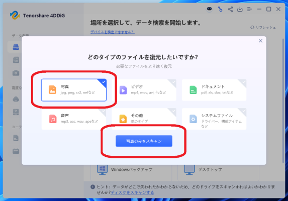 復元したいファイルの種類を選択して「スキャン」をクリック。今回は例として「写真」のみを選択します。