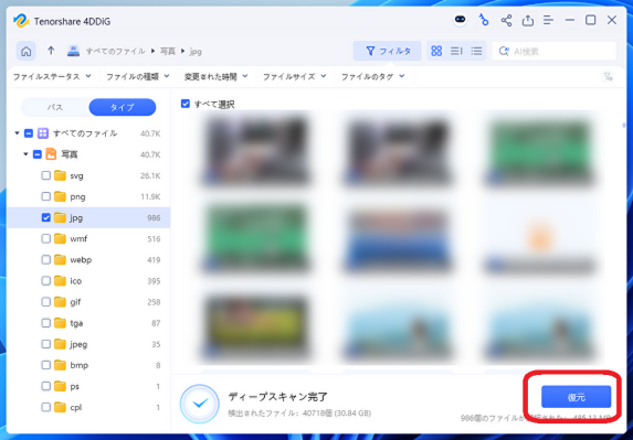 スキャンが終わったら、復元したいファイルを選択して「復元」をクリック。以上で完了です。スキャン元と同じドライブへの保存は必ず避けてください(上書きによる復元不能を防ぐため)。
